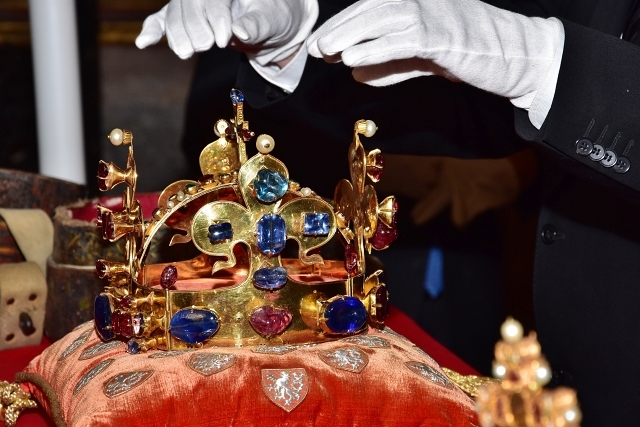 "Four soldiers from the Castle Guard carried the Jewels in a special box set on a litter from St. Wenceslav Chapel to Vladislav Hall, and then on to St. Vitus Cathedral for the church service which was celebrated by Cardinal Dominik Duka," said the Commander of the Castle Guard, Colonel Petr Prskavec.