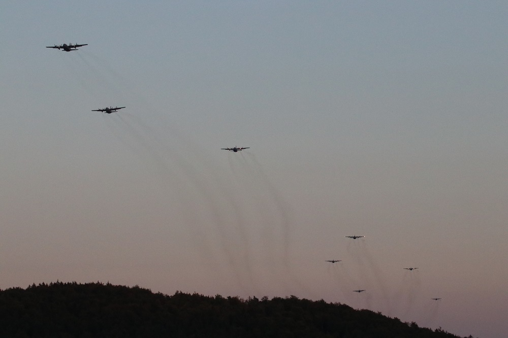 Czech paratroopers used the American T11 and T10 parachutes in a mass air jump from a C-130 Hercules and a C-17 Globemaster aircraft at an altitude of 250 metres.