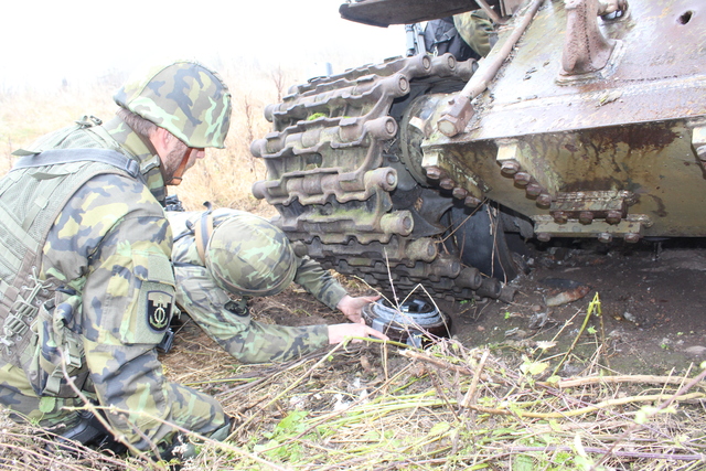 Major Koza explained that engineers had laid mines using mine throwers and, by carrying out simulated explosions of an old, immobile tank and other armoured vehicles, were able to experience first-hand the effects of these live blasts and also greatly improve their mine disposing and planting skills.