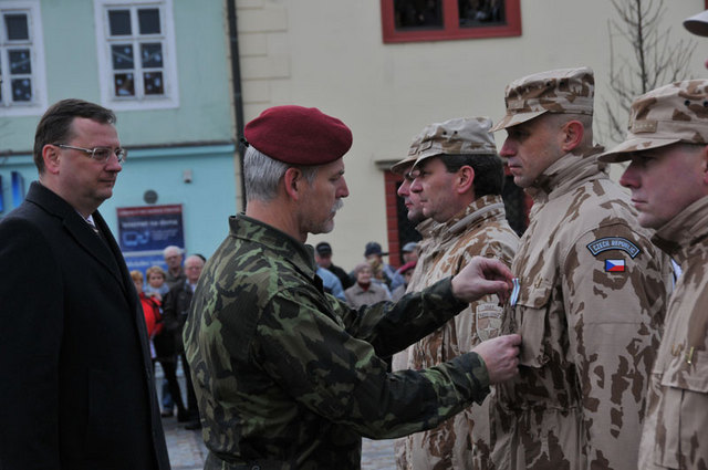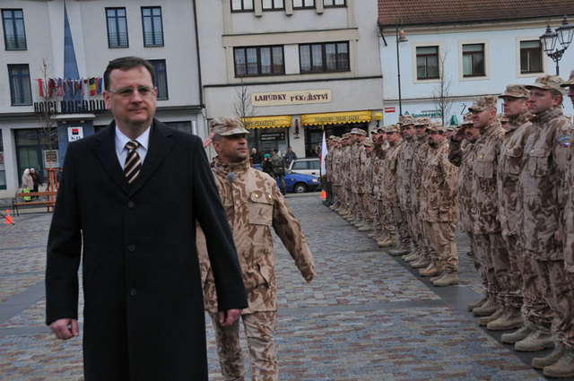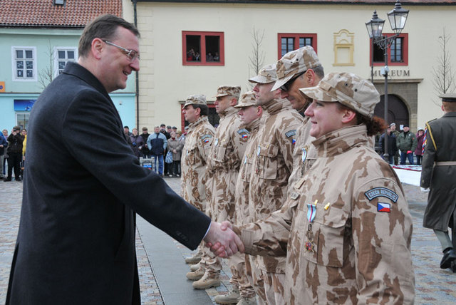 Prime Minister and acting Minister of Defence Petr Necas greets soldiers who returned from their ISAF mission in Afghanistan and congratulates them to awards they receive at a parade and welcome ceremony at Brandys nad Labem.