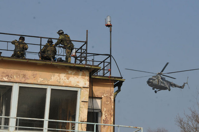 Příslušníci pohotovostního oddělení táborského velitelství Vojenské policie, kterému velí major Pavel Huták, se ve čtvrtek 22. března zdokonalovali ve slaňování z vrtulníku Mi -17.
