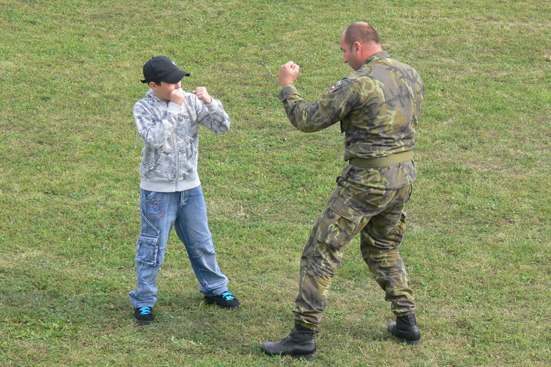 Prohlídka základny byla rozdělena na čtyři části. V té první děti zhlédly ukázku výcviku psů a bojové umění MUSADO. Velkým zážitkem pro čtyři z nich bylo, když si mohly bojové umění s vojáky samy vyzkoušet.