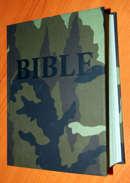 Česká biblická společnost, ve spolupráci s resortem obrany, připravila unikátní vydání bible určené pouze pro armádu a pracovníky Ministerstva obrany. Charakteristická a mimořádná je tím, že má přebal ze skutečného maskáčového plátna, ze kterého se šije polní stejnokroj. Nikdy předtím nebyla vydána bible, a podle mne ani žádná jiná kniha, která by byla zabalená do jiného plátna, než knihařského, vyrobeného pouze pro účel přebalu knih. Zároveň je každý exemplář jedinečným originálem, protože se maskovací vzor na každé jednotlivé knize projevuje pokaždé jinak. Chtěli jsme, aby bylo symbolicky „vidět“, že bible jakožto kniha, která v sobě nese zkušenosti mnoha generací ve vztahu člověka k bohu, k životu, ke světu a lidem, chce být společníkem vojáka při jeho starostech i radostech, nadějích i bolestech. Vojáci kvitují, že se bible „oblékla“ do stejného oděvu, ve kterém oni slouží… a také krvácejí i umírají…