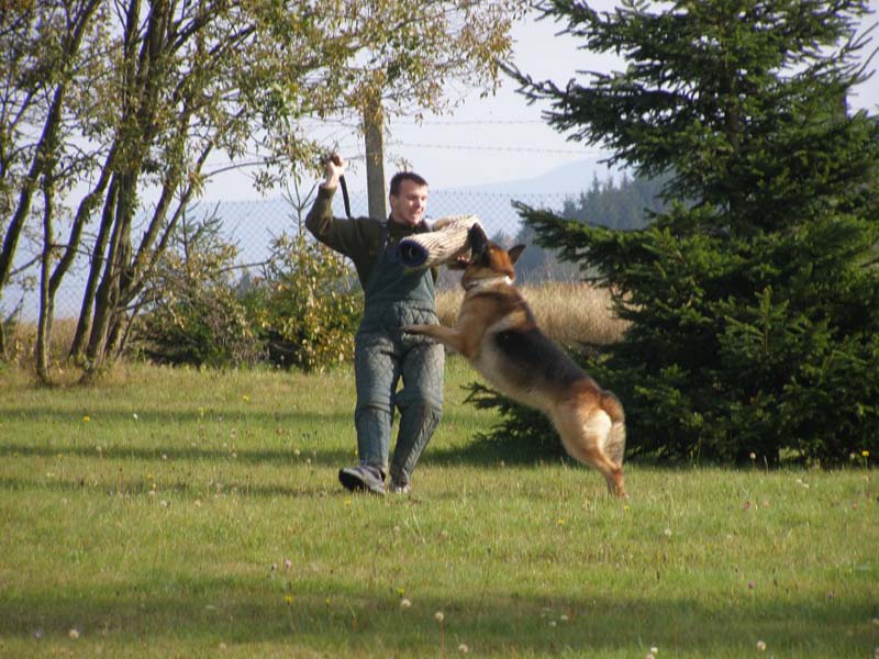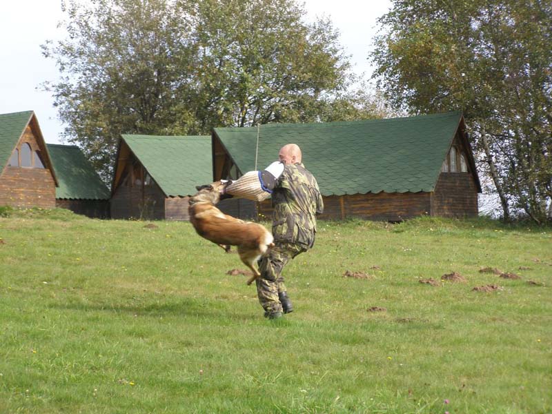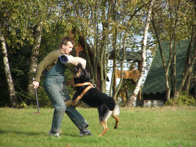 Všechny tři součásti vyvrcholily tím, co bylo doslova alfou i omegou celého snažení: výcvik psa v obraně. Tato náročná činnost byla rozložena do dvou cviků. Nácvik zadržení prchajícího narušitele na sto metrů a nácvik „zákusu psa v protiútoku“. Výcvik byl psovi ztížen i tím, že byl při svém útoku figurantem několikrát ohrožován obuškem, aby se zvyšovala jeho odolnost a zvykl si na to, že se mu může narušitel bránit.