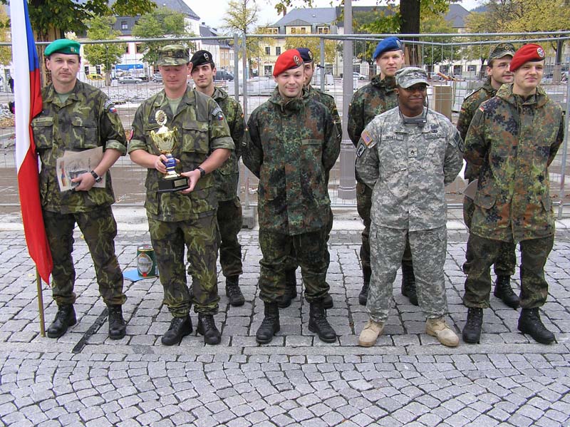 Vojáci vítězného týmu ALFA cvičili pod českou vlajkou. Na dalších místech skončily týmy s vlajkou Duryňska, USA, Bavorska a Saska.