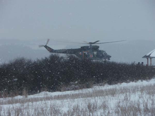 Z letiště Plzeň – Líně okamžitě odstartoval vrtulník s lékařem majorem Zdeňkem Paškem a zdravotní sestrou Markétou Groulíkovou na palubě. „Ve velmi těžkém terénu se dalo přistát pouze na malém prostoru pod vyhlídkou,“ líčil situaci pilot vrtulníku LZS W-3A Sokol kapitán Milan Vydra. Doktor Pašek po vysazení z vrtulníku ihned odhadl situaci a přivolal na pomoc kolegy ze Kbel, kteří mají zařízení na vyzvednutí pacienta z nepřístupného prostoru. Za pomoci hasičů se lékař se setrou vyšplhali k vážně zraněné ženě, aby zajistili základní životní funkce a zabránili prochladnutí zraněné až do příletu vrtulníku SAR ze Kbel.
