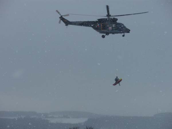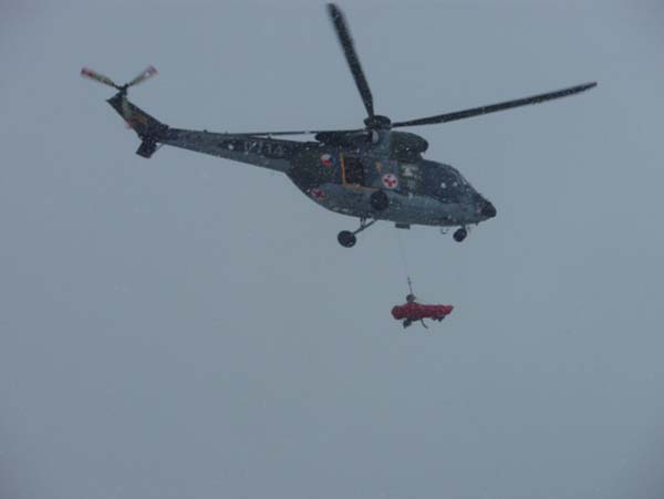 Pilot vrtulníku SAR kapitán Petr Šamaj zůstal na chvíli viset se svým strojem nad místem nehody. Z paluby W-3A Sokol se spustil záchranář s vakuovou matrací a společně s doktorem připravili ženu na vyproštění z exponovaného terénu. Zraněnou jeřábem vytáhli na palubu helikoptéry SAR a předali již připravenému vrtulníku LZS, který ženu přepravil do nejbližší nemocnice.