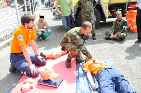 Záchranáři ze Zdravotnické záchranné služby hlavního města Prahy, prakticky předvedli zásady první pomoci. Do Dejvic přivezli také speciální sanitní vůz ATEGO, který je určen především k zásahu u hromadných neštěstí