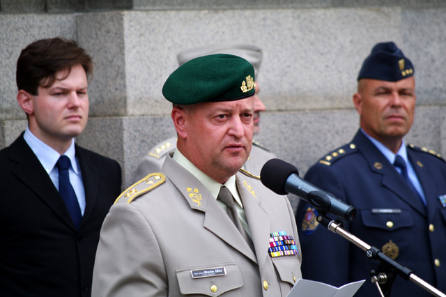 generálmajor Miroslav Žižka při úvodním vystoupení během vernisáže výstavy Od atentátu k válce