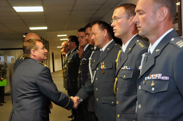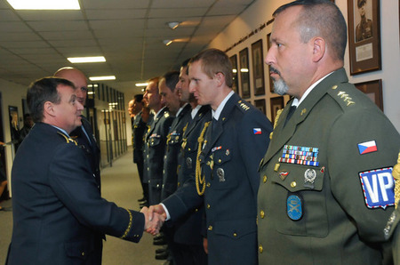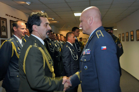 Generál Libor Štefánik (vpravo) blahopřeje k udělenému ocenění podplukovníkovi Zoltánu Zöldovi