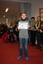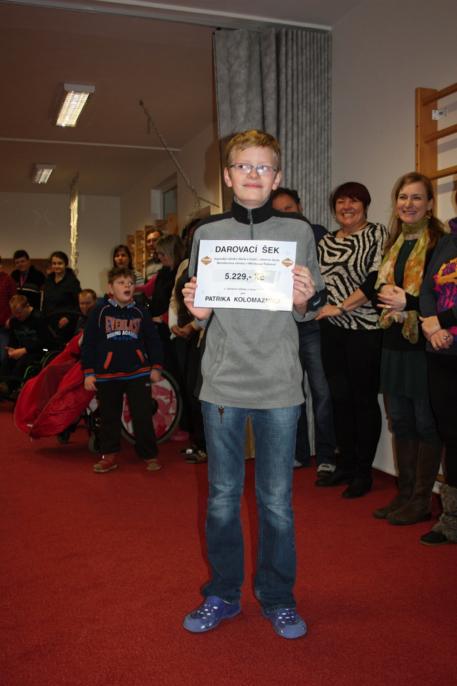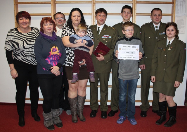 Zleva maminka čtyřletého Vítka převzala od velitele školního praporu symbolický šek a malý Vítek v postýlce