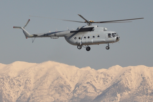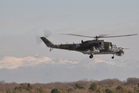 Jedna z mezinárodních osádek při letu v Mi-24 nad chorvatskými zasněženými vrcholky
