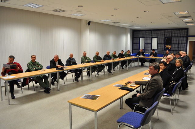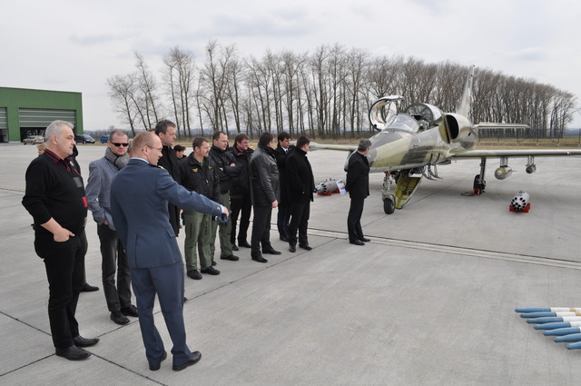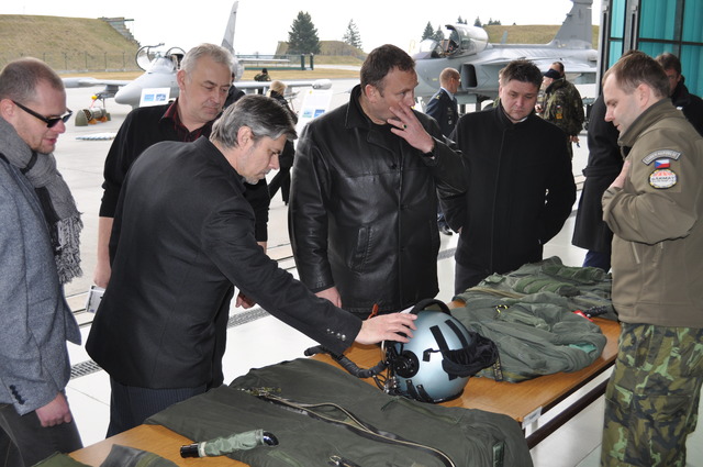 Z úvodního briefingu, v čele zleva: ředitel Kabinetu ministra obrany Jan Rouček, předseda Výboru pro obrany PS PČR David Kádner, zástupce velitele 21. základny plukovník Ondřej Rejman