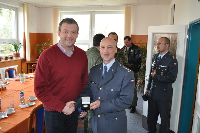 Zástupce velitele 21. základny plukovník Rejman předává pamětní minci předsedovi Národní rady Slovenské republiky Jaroslavu Baškovi