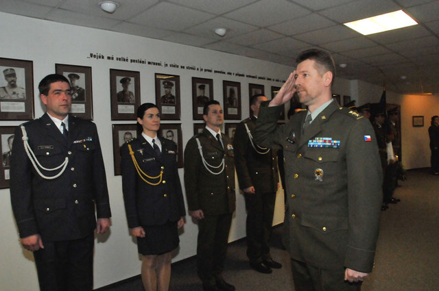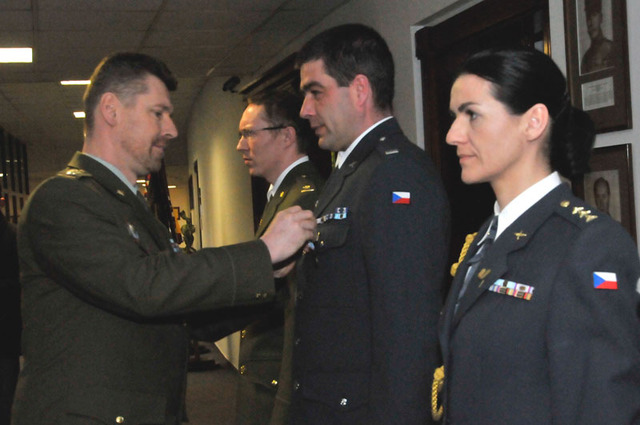 Medaili ministra obrany Za službu v zahraničí předává plukovník Šíba praporčíku Rudolfu Bartošovi, stejné ocenění se dostalo dalším pěti účastníkům nástupu - v popředí nadporučice Jitka Brabencová