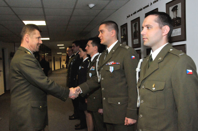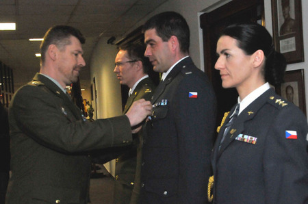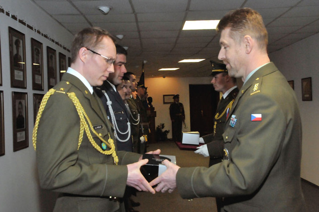 Plukovník Radek Šíba blahopřeje k udělené medaili rotmistru Hynku Ryšavému, v popředí praporčík Tomáš Vítek