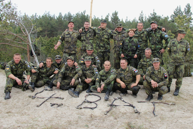 Rotmistr Jan Tichý (první řada, třetí zprava) s kolegy po úspěšných bojových střelbách z protiletadlového raketového komplexu 2K12 KUB v Polsku.