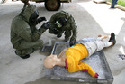Cvičící provádí dekontaminace zraněné osoby s využitím individuálního protichemického balíčku IPB-80