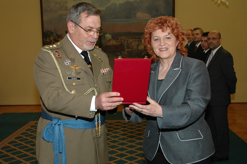 Colonel Francisco Javier Blasco-Robledo, representative of Spain and doyen of the Association of Military and Air Attaches accredited in Prague, on behalf of all attaches thanked the Minister for her invitation and presented her a cup with Association logo.