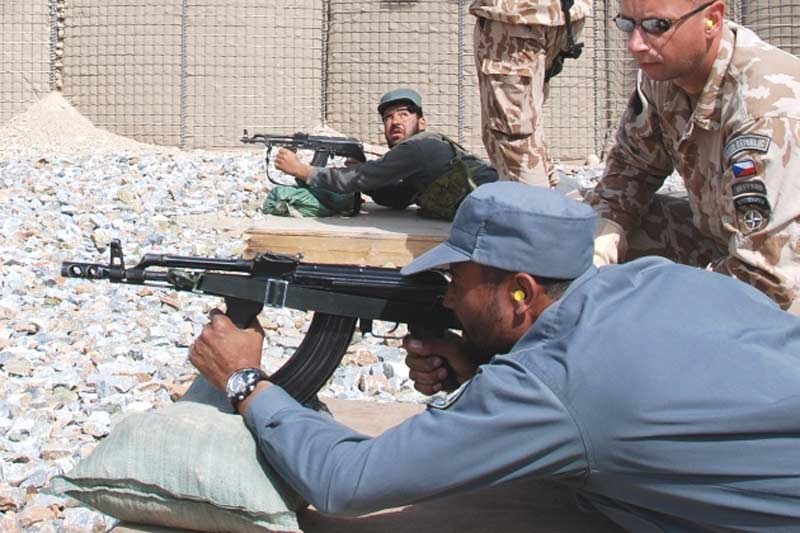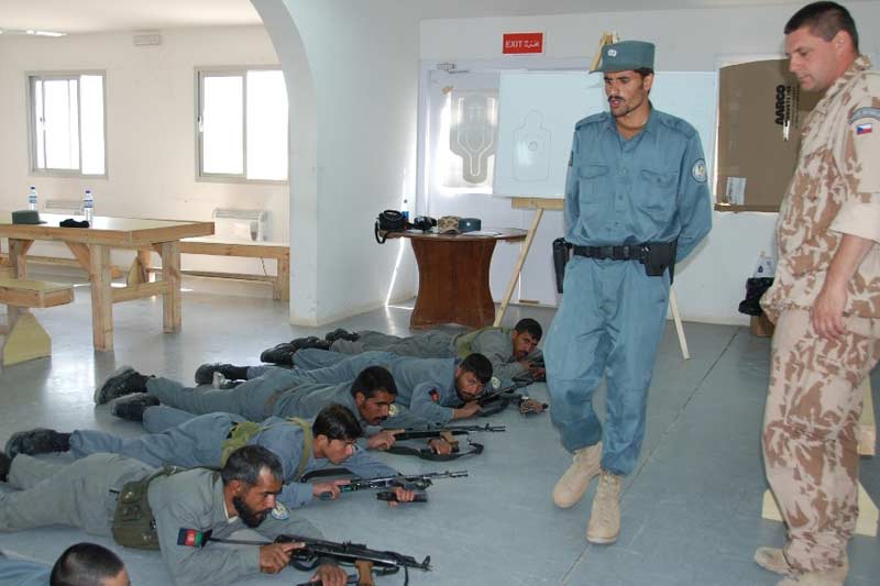 Afghan National Police soldiers are trained by Czech soldiers in Logar province.