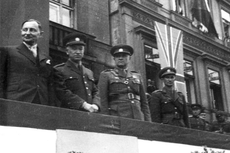 Stíhací letouny Lavočkin La 5FN 1. čs. smíšené letecké divize v SSSR na letišti v Letňanech 1. června 1945 | Na čestné tribuně zleva ZdeněkFierlinger, Edvard Beneš a generál Ludvík Svoboda (30. květen 1945) | Stroje čs. pilotů z Velké Británie na letišti v Ruzyni (13. srpen 1945) | Tank Cromwell Čs. samostatné obrněné brigády na přehlídce 30. května 1945 |