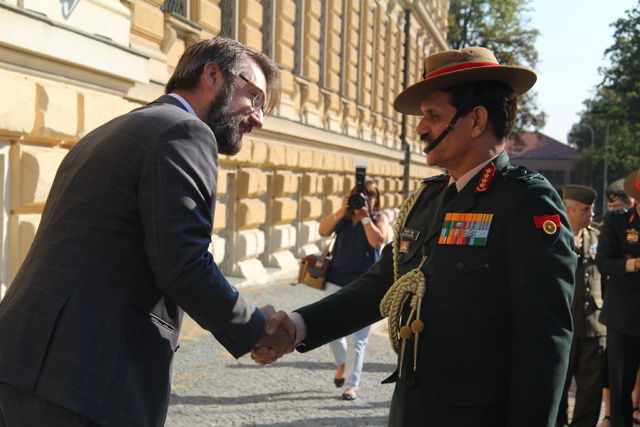 Před budovou ministerstva obrany vítal indického generála náměstek ministra Jakub Landovský