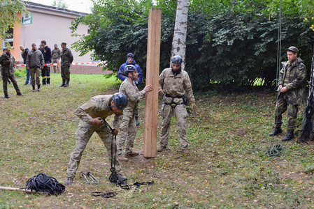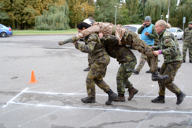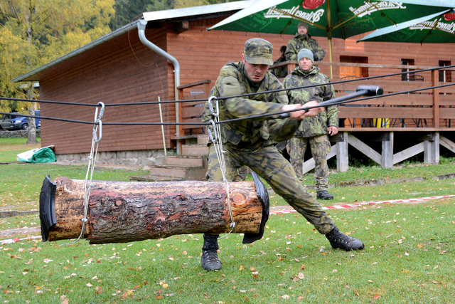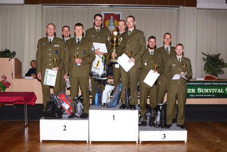 Vítězné družstvo 44. lehkého motorizovaného praporu přebírá putovní pohár náčelníka Generálního štábu AČR od plukovníka gšt. J. Alana