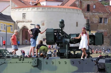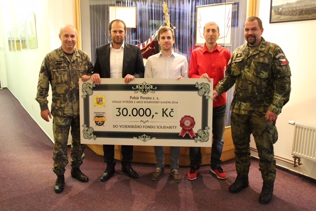 Zleva: plk. Roman Náhončík, náměstek Pavel Beran, Vojta Marvan, Martin Šindelář a praporčík Martin Kocourek s šekem pro Vojenský fond solidarity