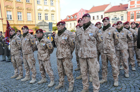 Část vojáků 6. strážní roty BAF, kteří na Resselově náměstí v Chrudimi převzali ocenění za odvedenou práci v Afghánistánu