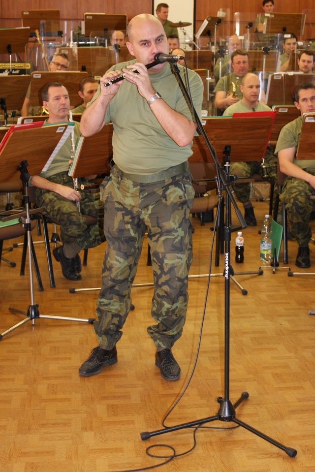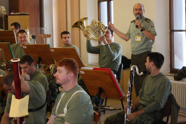 Velitel hudby pplk. Šíp při krátkém výkladu o lesním rohu.
