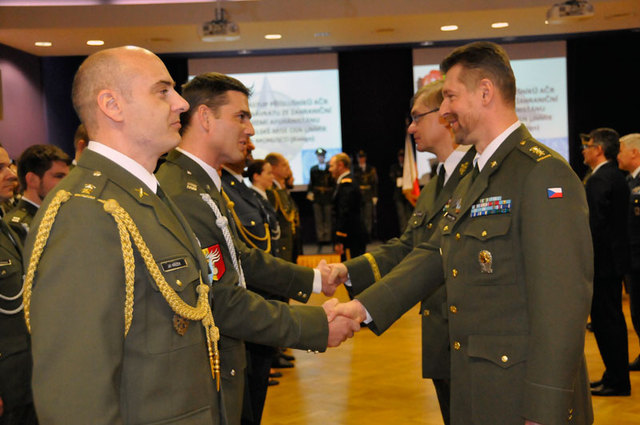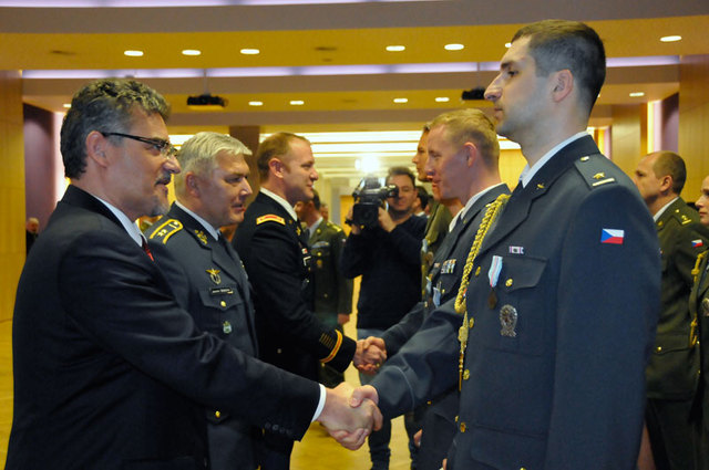 Ocenění jménem ministra obrany předával náměstek Tomáš Kuchta, spolu s ním blahopřejí vojákům velitel Vzdušných sil AČR generálmajor Jaromír Šebesta a zástupce vojenského přidělence USA v ČR major Mark White