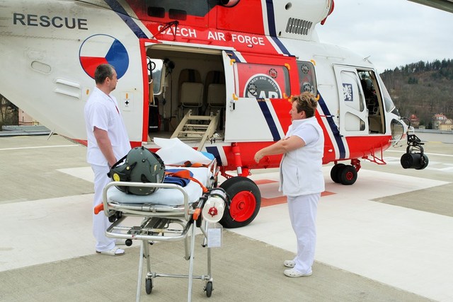 Lékaři karlovarské nemocnice u vojenského vrtulníku
