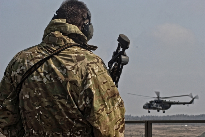 Odstřelovač sleduje vrtulník ve visu, z jehož paluby se právě jiní snaží zasáhnout cíl