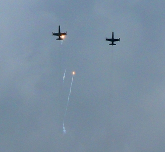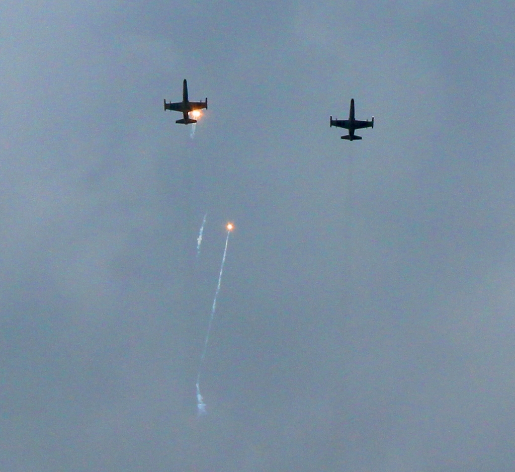 Bojové letouny L-159 ALCA vystřelovaly během ukázky pilotáže infračervené klamné cíle takzvané fléry.