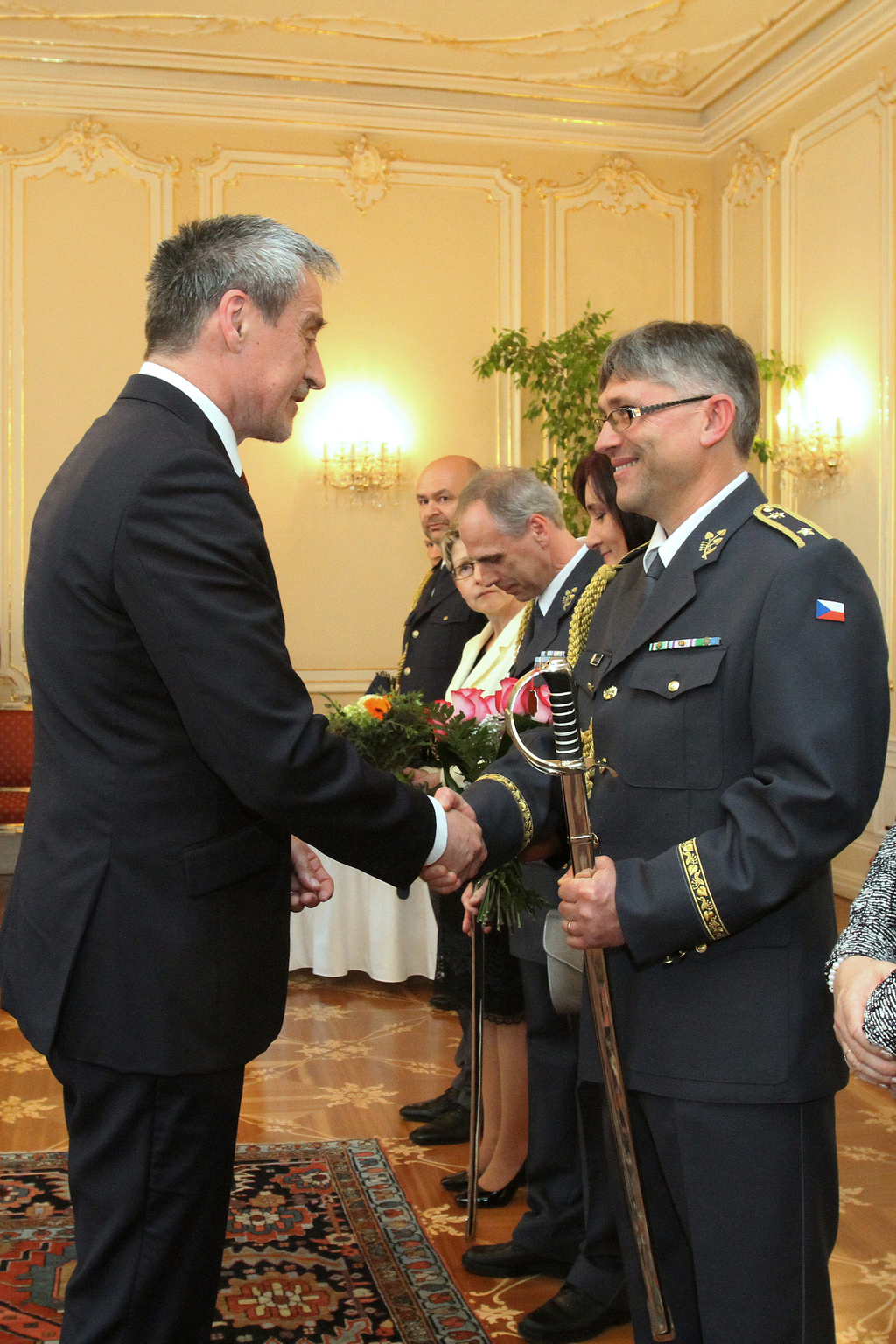 Ministr obrany Martin Stropnický gratuluje generálovi Františku Ridzákovi ke jmenování do generálské hodnosti