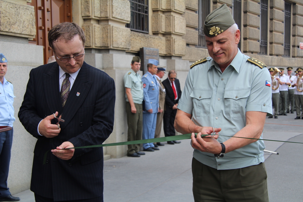 Generálporučík František Malenínský přestihl pásku společně s autorem výstavy Tomášem Jaklem z VHÚ