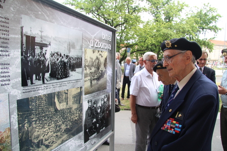 Historik Tomáš Jakl představuje generálu Františku Malenínskému výstavu o bitvě u Zborova