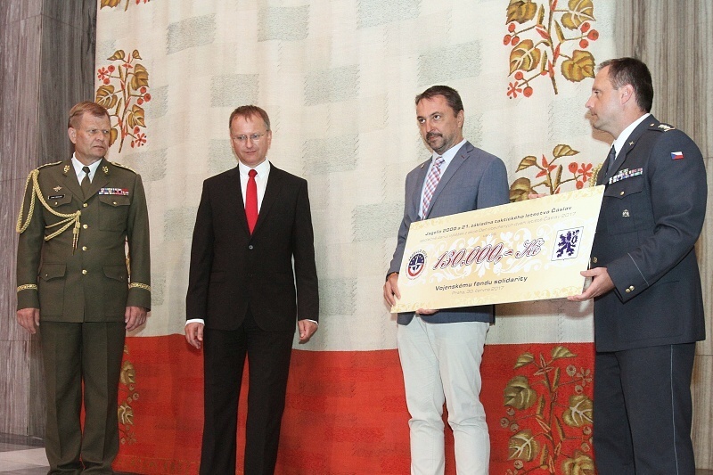 V Národním památníku na Vítkově v rámci připomínky Dne ozbrojených sil převzali šek od velitele letecké základy Čáslav Petra Tománka a předsedy Jagello 2000 náměstek ministra obrany Daniel Koštoval a náčelník Generálního štábu Josef Bečvář