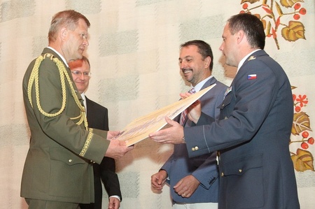 Šek právě drží v ruce náčelník Generálního štábu armádní generál Josef Bečvář, přihlíží náměstek ministra obrany Daniel Koštoval
