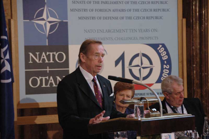 Prvním odpoledním vystoupením na mezinárodní konferenci byl příspěvek bývalého prezidenta Václava Havla, která zavzpomínal na cestu, po které se vydala Česká republika k branám NATO.