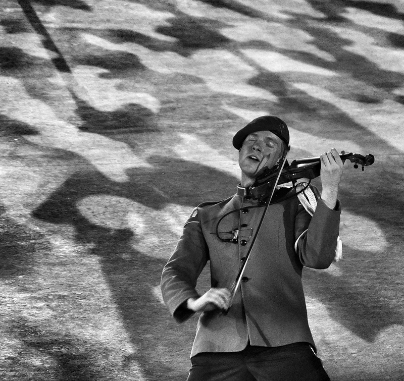 Člen Velkého smyčcového orchestru The Finnish Conscript Band během jejich showprogramu