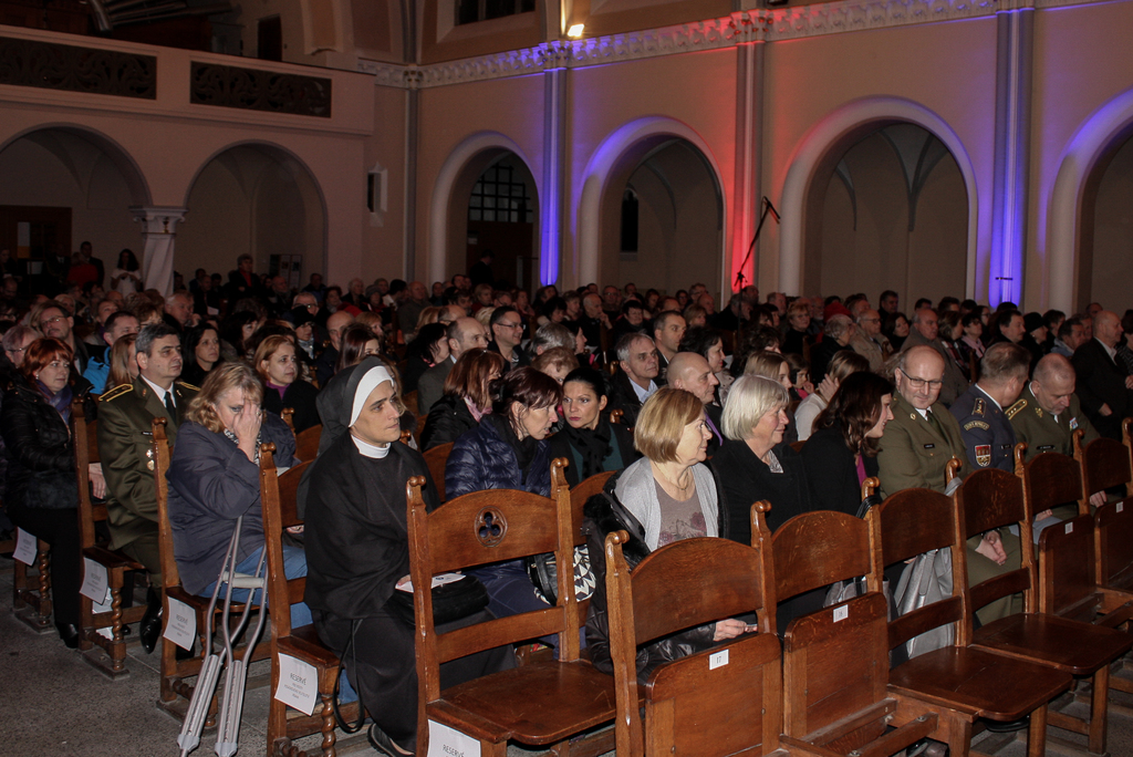 Uvítání patriarchy Církve československé husitské Tomáše Butty velitelem posádky Praha plukovníkem Milanem Virtem a místostarostou Prahy 6 Janem Lacinou před začátkem koncertu