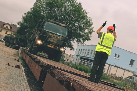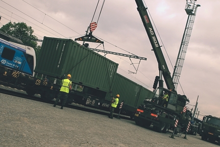 Navádění a najíždění techniky na železniční vozy na strakonickém nádraží.
