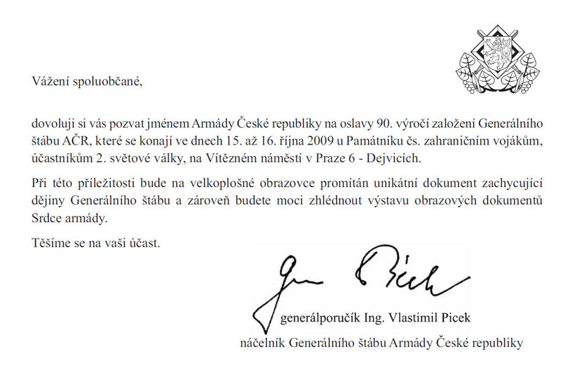 dovoluji si vás pozvat jménem Armády České republiky na oslavy 90. výročí založení Generálního štábu AČR, které se konají ve dnech 15. až 16. října 2009 u Památníku čs. zahraničním vojákům, účastníkům 2. světové války, na Vítězném náměstí v Praze 6 - Dejvicích.