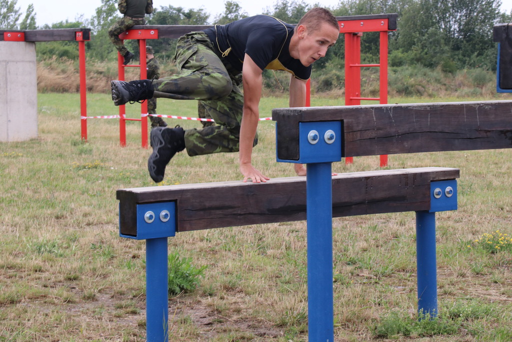 V domácím prostředí výsadkářů u letiště v Chrudimi čekala účastníky výsadková překážková dráha – nejprve každý jednotlivec…