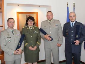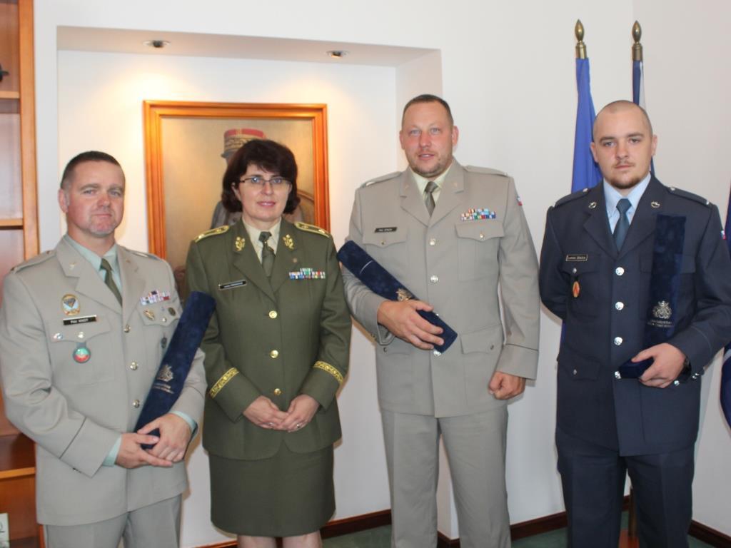 Oceněným poděkovala a popřála mnoho dalších úspěchů také generálka Lenka Šmerdová. Zleva: rotmistr Petr Knot, četař Petr Stach, brigádní generálka Lenka Šmerdová a četař Ladislav Zekucia
