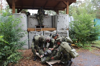 Poskytování první pomoci vojákovi po pádu ze strážní věže
