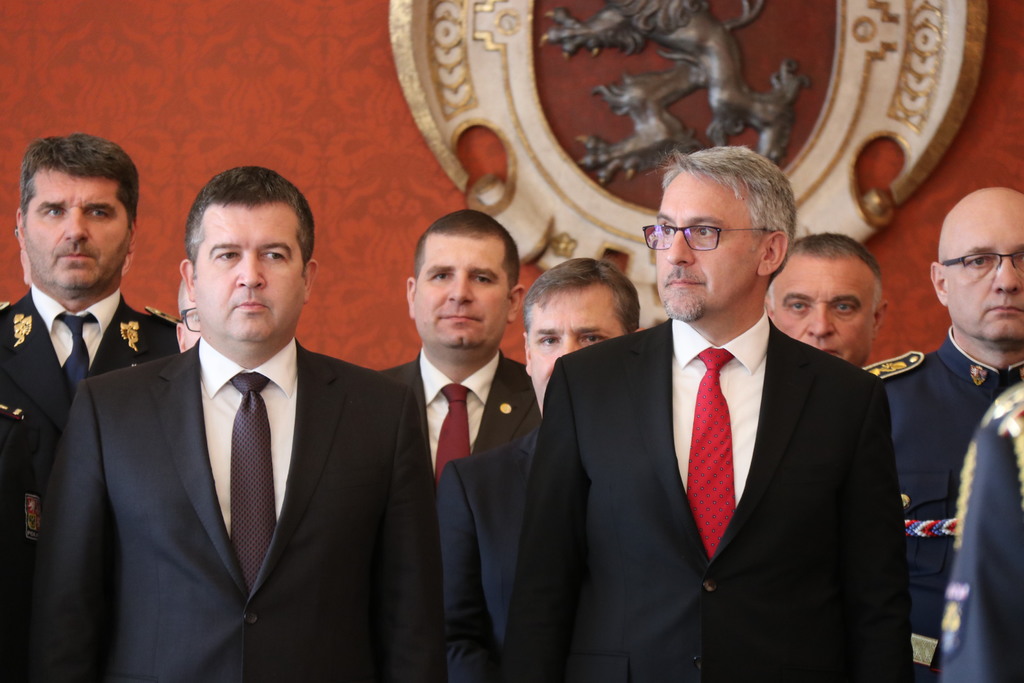 Jmenování nových generálů na Pražském hradě se zúčastnil spolu s dalšími státními představiteli ministr obrany Lubomír Metnar (druhý zprava)