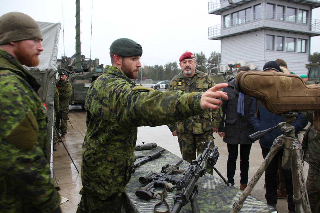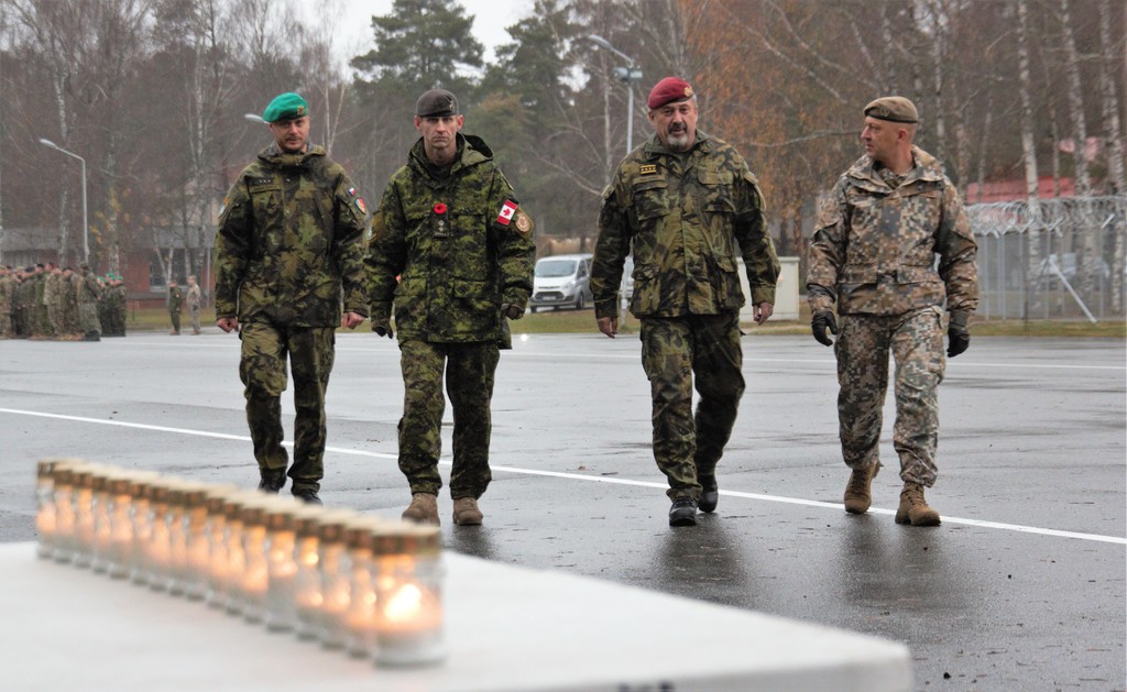Generál Aleš Opata s lotyšským velitelem plukovníkem Sadrisem Gaugersem, kanadským velitelem úkolového uskupení Alianční předsunuté přítomnosti podplukovníkem M.J. Reekiem a velitelem 3. úkolové uskupení AČR eFP v Lotyšsku nadporučíkem Jaromírem Haplou