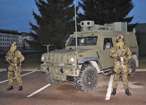 Přehlídka vojenské techniky jednotek devíti členských států Alianční předsunuté přítomnosti na základně v Adaži